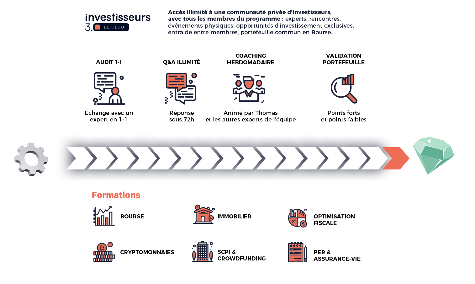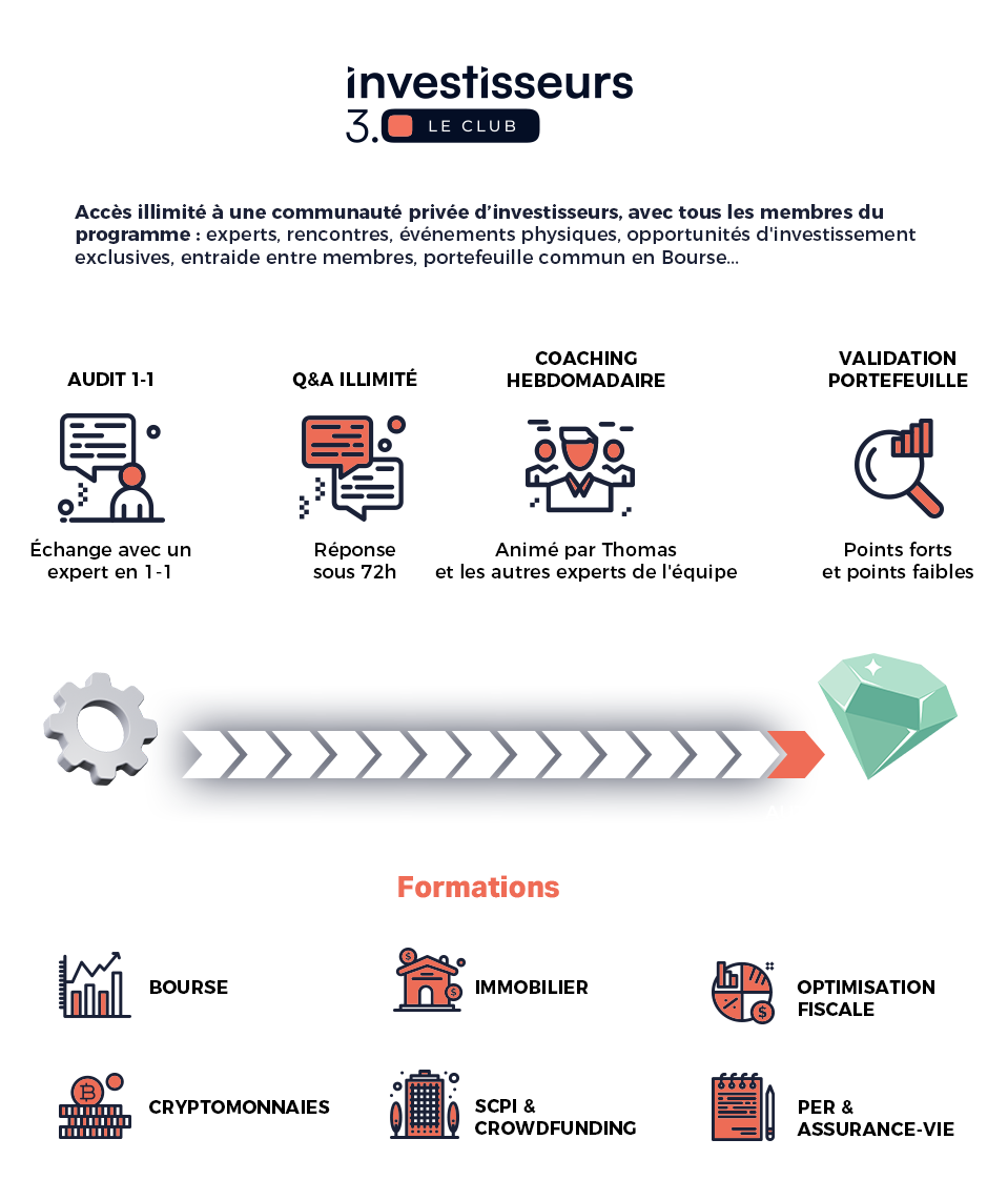 L’accès au club Investisseurs 3.0, quant à lui, va beaucoup plus loin. Les membres bénéficient de contenus approfondis, d’analyses détaillées, de formations structurées, d’un accès à la communauté privée ainsi que d’échanges réguliers autour des stratégies d’investissement.